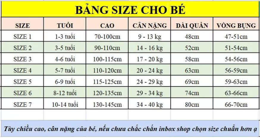 Bảng size trên mang tính chất tham khảo, phù hợp với đa số các bé. Nếu ba mẹ chưa chọn được size phù hợp vui lòng chat với shop để được tư vấn kĩ hơn ạ