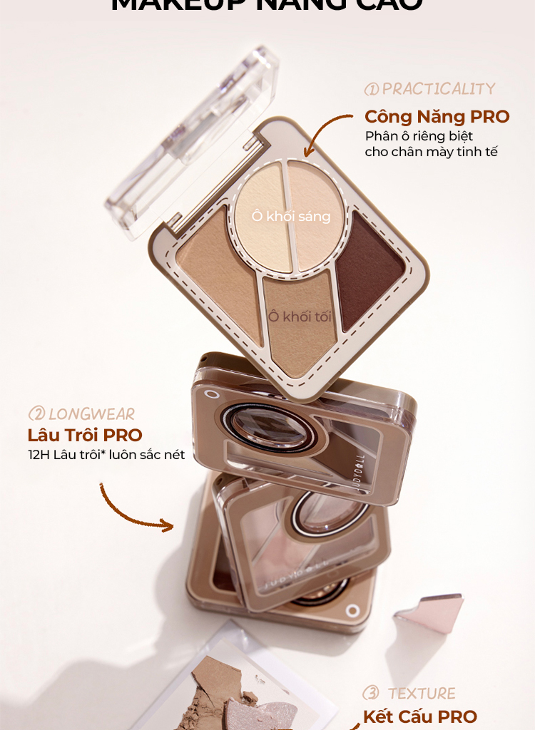 ✔ Hỗn hợp 5 sắc độ thiết yếu được phân ô sáng – tối, ô nhũ – màu, ô phối màu – chức năng rõ ràng