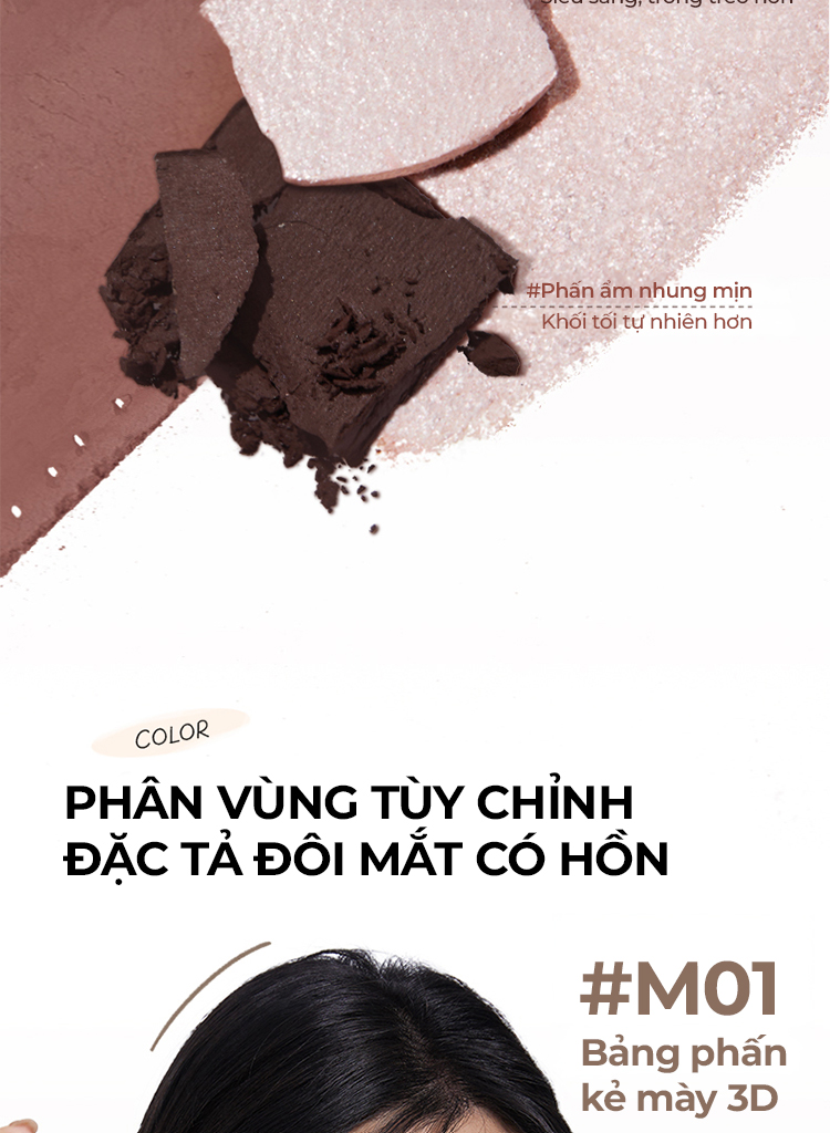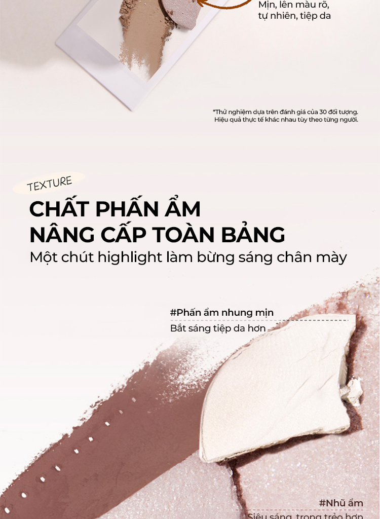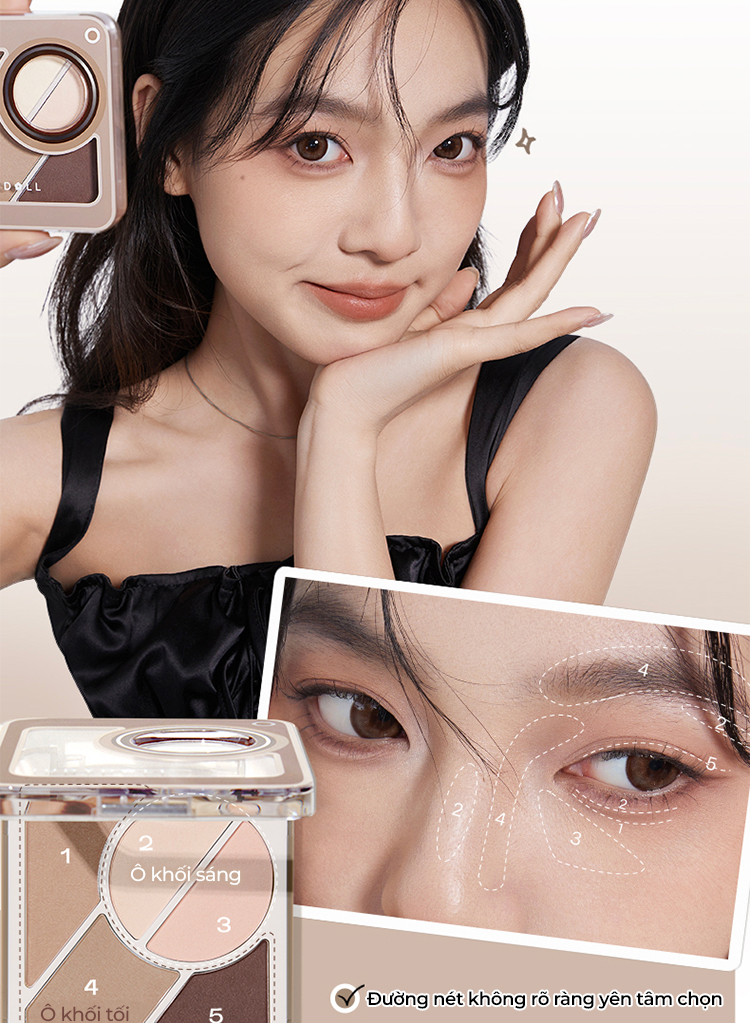 1️⃣ Dùng cọ hoặc đầu ngón tay chấm phấn và tán lên vùng mắt/mày theo các ô chức năng đã được phân vùng
