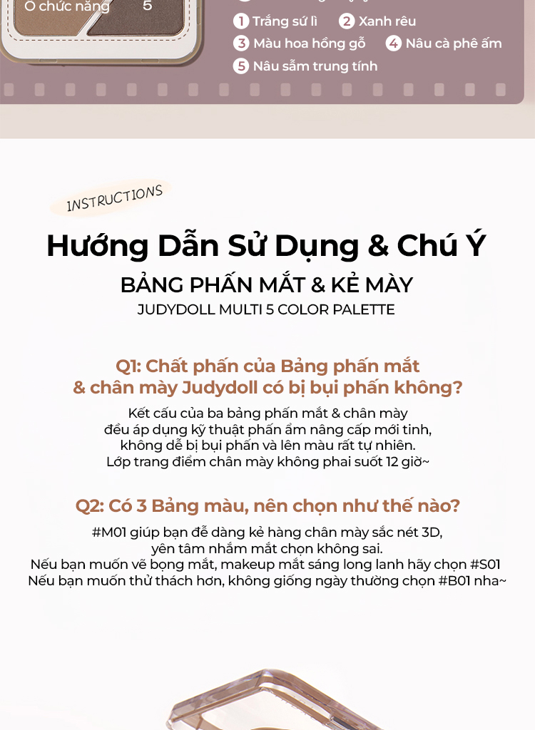 Bảng phấn mắt & kẻ mày Judy Doll Multi 5 Color Palette gồm 5 ô màu đa năng: kẻ mày, kẻ mắt, vẽ bọng mắt,… chất phấn ẩm, mềm mịn, lên màu rõ, tiệp da.